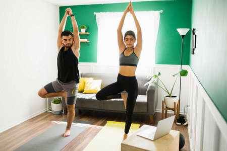 White caucasian fit sporty couple doing yoga tree pose in living room at home watching online tutorials from trainer on laptop. Working out, fitness sport and healthy lifestyle concept.