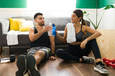 Attractive young man and woman drinking water after doing their cardio workout in the living room