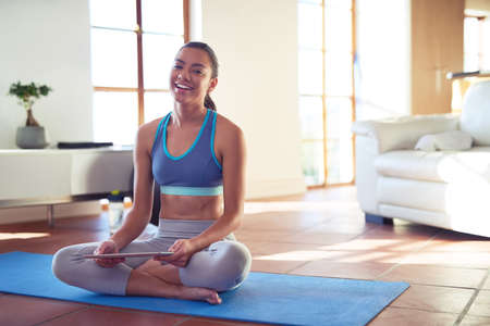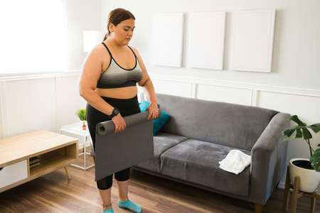 Attractive overweight woman in sportswear preparing to do a home workout while dieting to lose some weight
