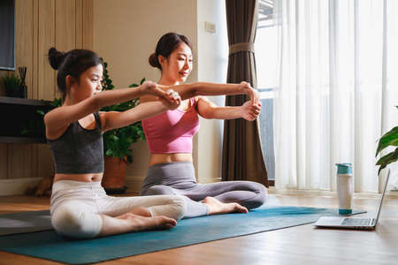 Asian woman and Little girl practicing yoga from yoga online course via laptop at home. Healthy lifestyle - technology at home. New normal lifestyle. Home Online Stretching Yoga Fitness Exercise.