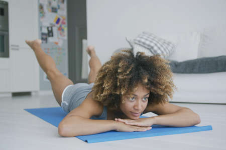 Concept of sport, fitness and morning workout. Smiling african american girl standing in plank position on yoga mat. Woman in casual clothes making daily training at home