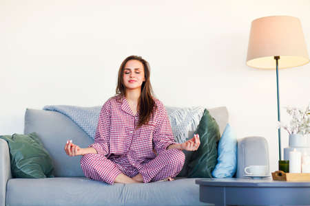 Young woman doing yoga meditation routine in the morning