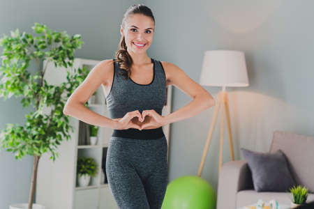 Pretty sportswoman warming up in living room
