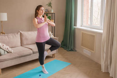 Empty space for text. A young woman of 20-25 does yoga at home.