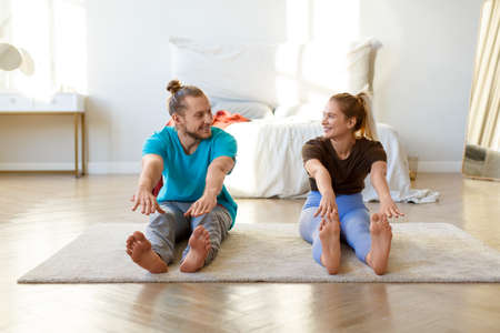 Couple exercising together on the modern kitchen floor. Man and woman in sports wear doing workout at home. Caring girl helping her boyfriend to do stretching. High quality photo.