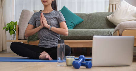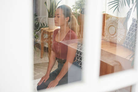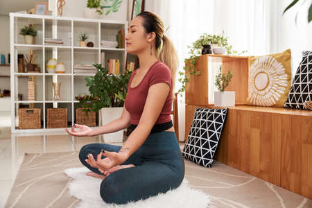 Pretty young Asian woman practicing meditation at home