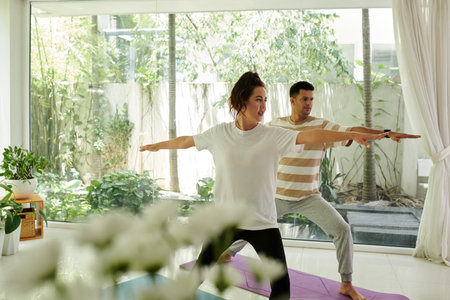Young Asian woman and man doing yoga exercise in living room at home