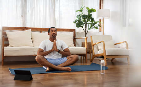 African American man practicing yoga and meditating in lotus position on yoga mat at home.