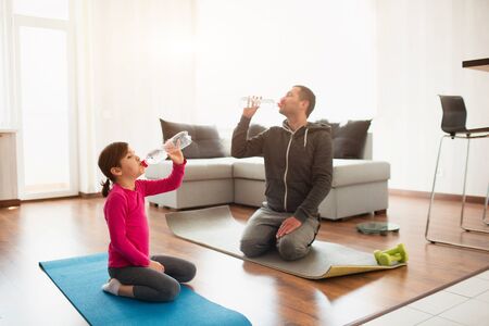 father and daughter are training at home. Workout in the apartment. Sports at home. They sit on yoga mats and drink water. You need clean water to drink your sport time.