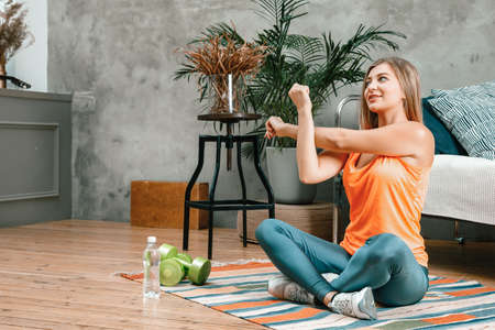 Stretching on floor. Young woman exercising fitness, aerobic, yoga at home, sporty lifestyle and home gym. Getting active during lockdown, quarantine. Healthcare, movement, wellness and action concept.