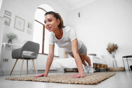 Sporty young woman doing plank exercise indoors at home