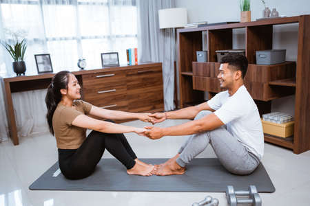 Asian fitness couple, man and woman exercising together at home doing yoga in livingroom facing each other