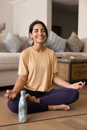 Cheerful Hispanic yogi woman meditating at home with closed eyes, doing yoga on mat unrolled on floor, smiling, laughing, sitting at bottle with cold drink or water. Vertical shot