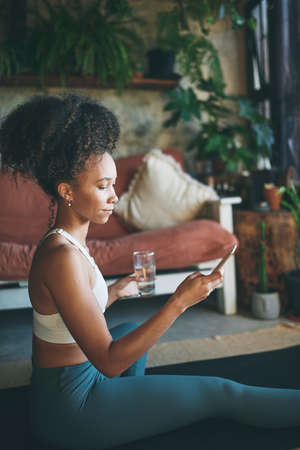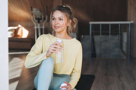 Shot of sporty young woman looking to sideways while holding water after hypopressive exercises resting on the floor in living room at home.