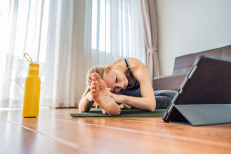 Fitness woman exercising on the floor at home and watching fitness videos in a tablet. People do sports online because of the coronovirus