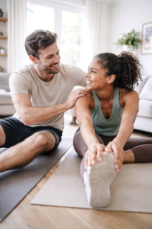Young active intercultural couple in sportswear stretching arms while standing on mats in front of camera at home and doing exercise