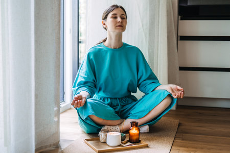 Woman practicing mindfulness sitting on carpet