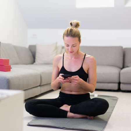 Young white woman sitting on yoga mat while working out in room