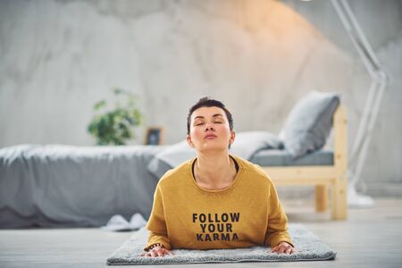 Cheerful pretty woman practicing yoga at home