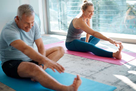 Getting in a good warmup. High angle shot of a mature couple stretching on yoga mats before working out at home.