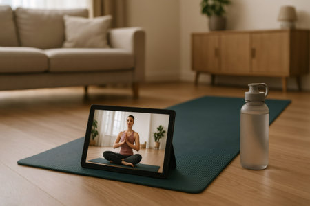 Tablet displaying an online yoga class on a mat, accompanied by a water bottle, set in a cozy living room environment