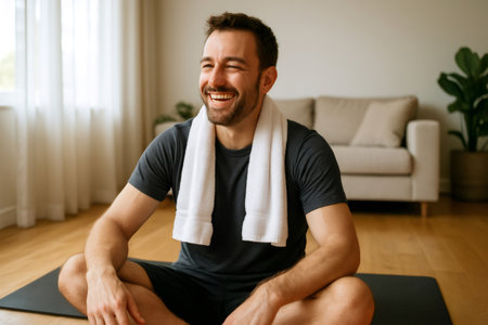 Man sitting on a yoga mat, smiling with a towel around his neck, enjoying a moment of relaxation in a cozy living room