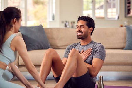 Man With Female Personal Trainer Doing Sit Ups As Part Of Exercising At Home