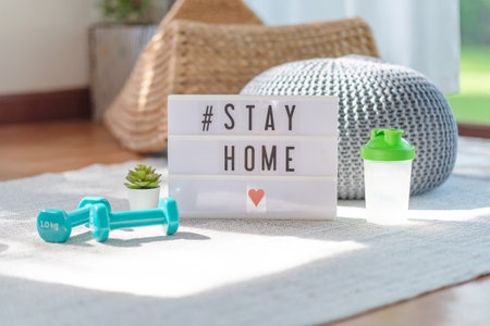 Sport equipment and lightbox with hashtag FITNESS AT HOME on window sill indoors. Message to promote self-isolation during pandemic