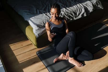 Happy african american girl in earphones using cellphone while doing yoga practice at home room