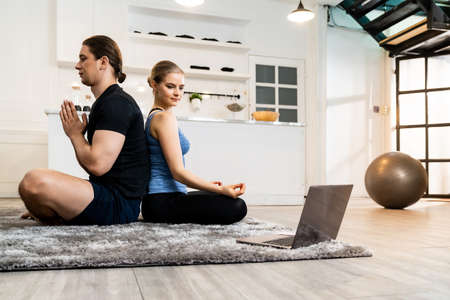 Fitness, sport, yoga, people and lifestyle concept. Sporty Caucasian couple making yoga exercises, sitting on the yoga mat in lotus position, in front of gray sofa at cozy room at home.