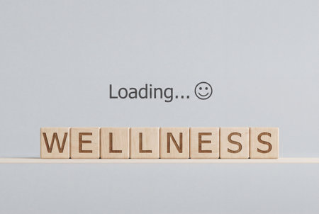 Eight light wooden cube blocks align to spell wellness on a shelf while the text loading and a smiley face appear on the gray wall above to symbolize mental health progress.