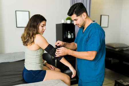 Latin young physical therapist putting on an arm brace on a female patient. Physiotherapist treating an injured young woman