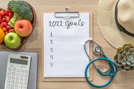 2022 goals on clipboard note pad for new year reminder list of yearly planner, health plan for work-life balance on desk with background of computer, calculator, travel hat and healthy food