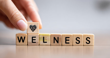 A hand places a wooden block with a heart symbol onto a set of blocks spelling WELLNESS. The scene shows a warm color palette with natural wood texture, subtle background. The image could be used for promoting health, wellbeing, or medical-related subjects. Suitable for various editorial and commercial applications.
