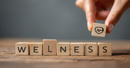 A hand places a wooden block with a graphic atop blocks spelling 'wellness'. The composition showcases natural wood tones and soft lighting. This image could be used for articles, advertising, or educational materials related to health and lifestyle, highlighting concepts of self-care and well-being.