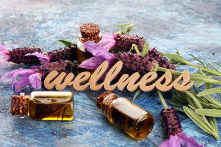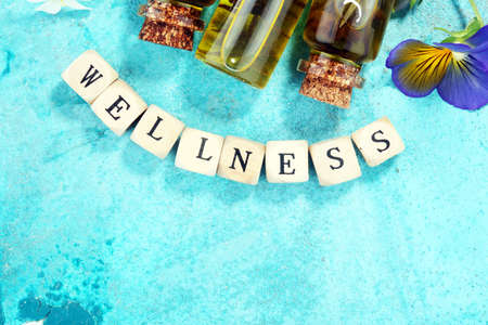 lavender oil in a glass bottle on a background of fresh flowers and Wellness sign with wooden cubes