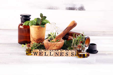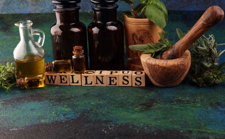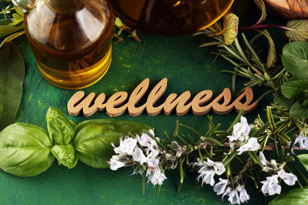 Homegrown and aromatic herbs and wellness letters made of wood. Set of culinary herbs. Green growing sage, oregano, thyme, basil, mint and oregano.