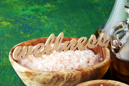 Crystals of salt on table. himalayan pink salt and wellness letters made of wood