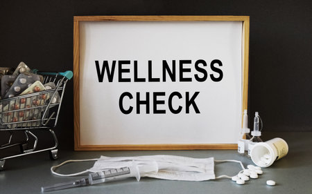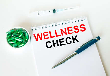 Text Wellness Check written in a notebook with a blue pen and a bunch of pills. Can be used as a medical concept