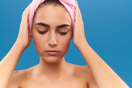 girl with pink towel on head with hands on head.