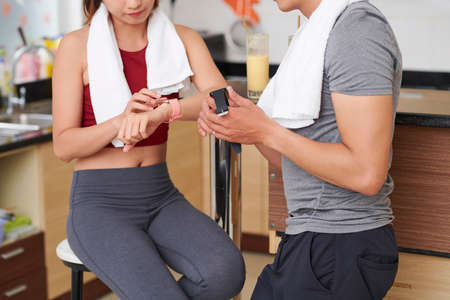 Cropped image of fit young people sitting in juice bar in gym and checking information on fitness trackers