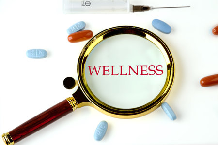 Wellness text written through a magnifying glass on a white background