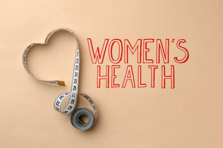Measuring tape near words Women's Health on beige background, top view