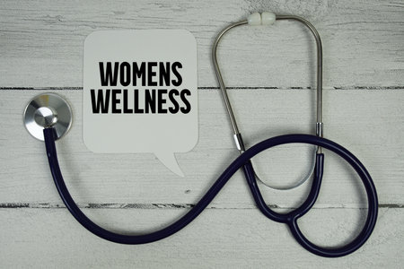 Womens Wellness text with Medical Stethoscope on wooden background