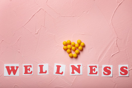 Cards with word WELLNESS and pills on color background. Health care concept