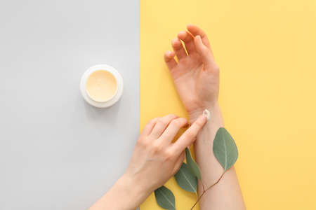 Woman applying hand cream on color background