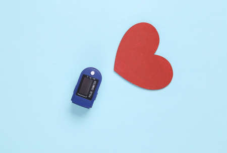 health care concept. Pulse oximeter (a device for measuring oxygen in the blood) and a heart on a blue background. top view