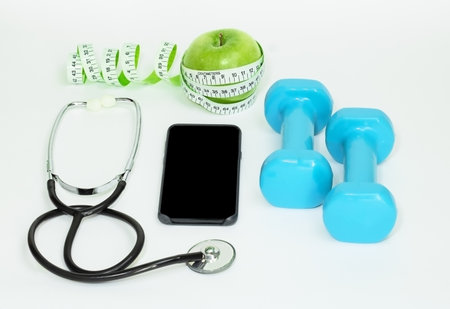 Smartphone, measure tape green apple dumbbellstethoscope