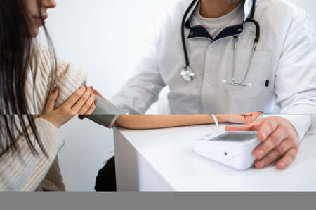 Close-up view of a doctor measuring blood pressure on a woman's arm in a hospital. heart health concept