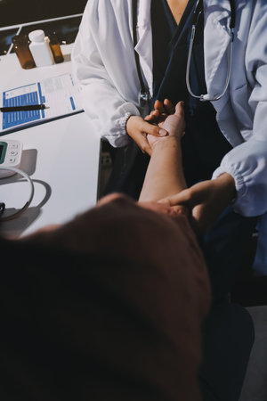 The doctor examines the patient's pulse by hand and records the results, health medical checkup concept.